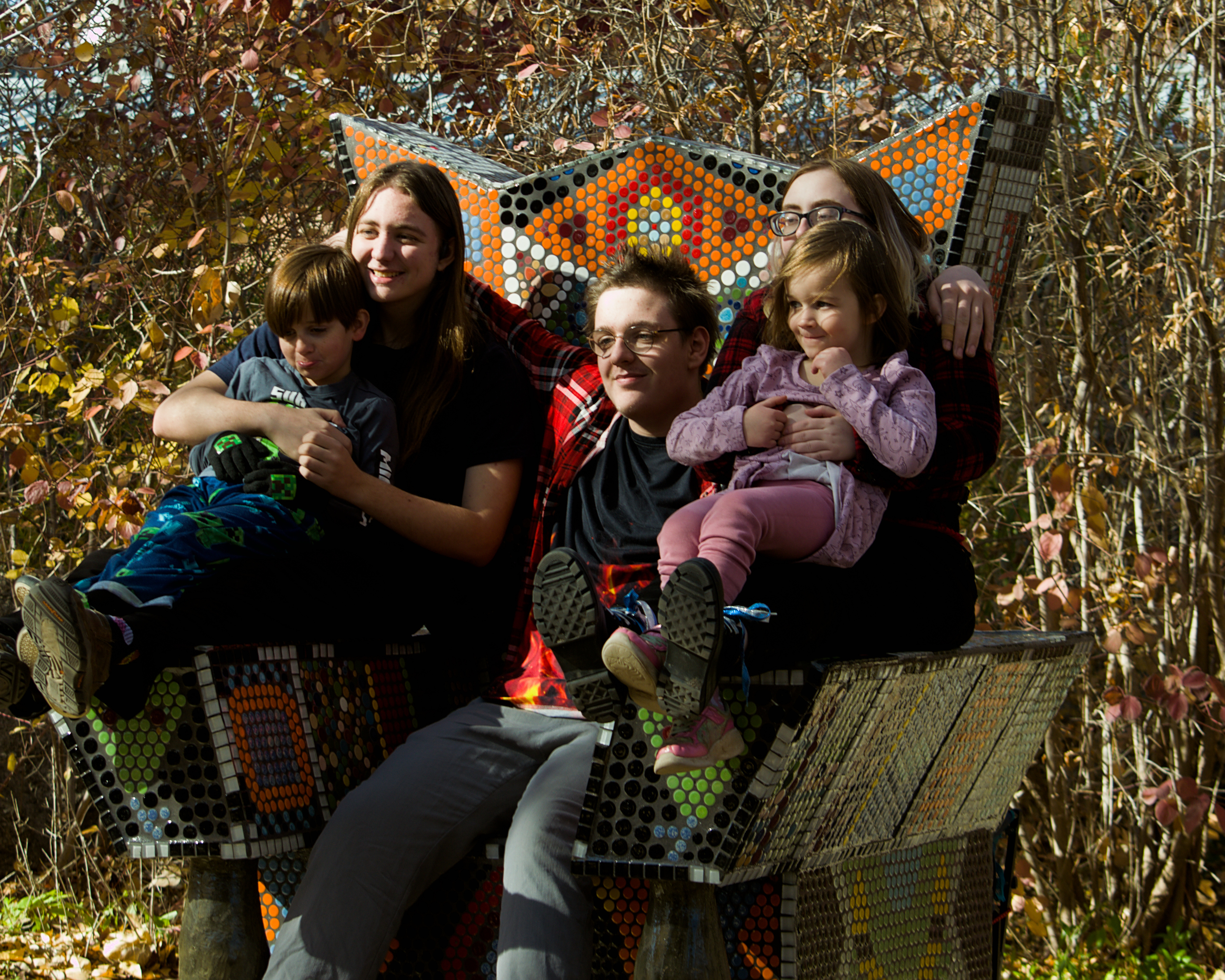 JR, Jax, Sebastian, Ashland, and Azriel sitting on a brightly painted chair at the zoo